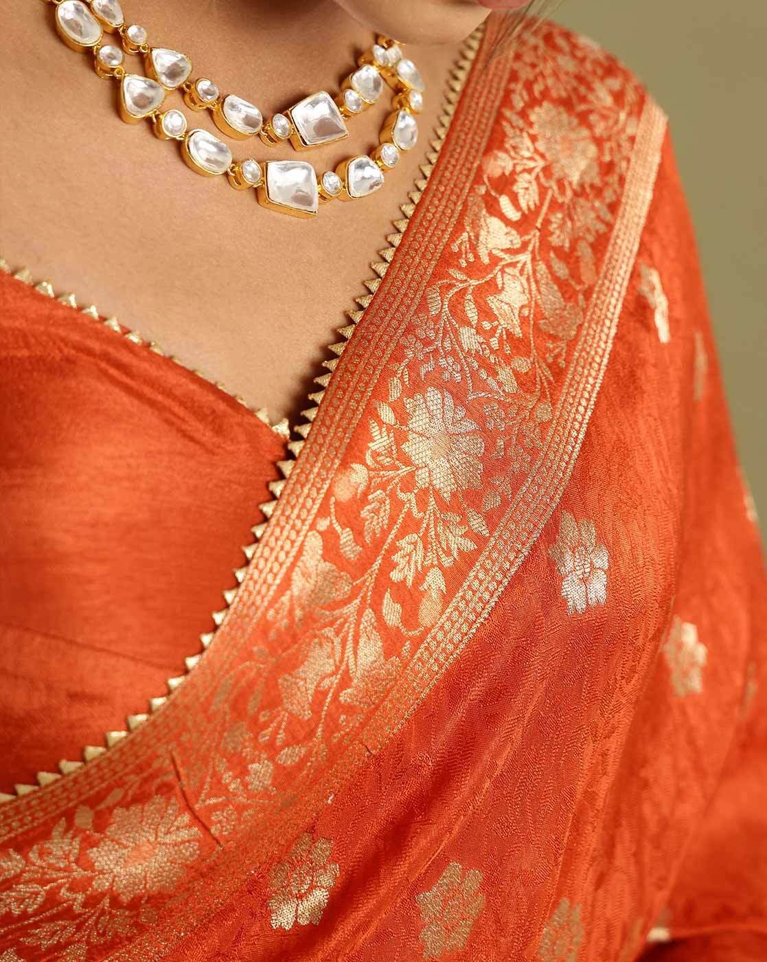 • The last image gives a detailed look of the blouse piece that comes with this saree (The model is wearing a blouse from our in-house wardrobe)